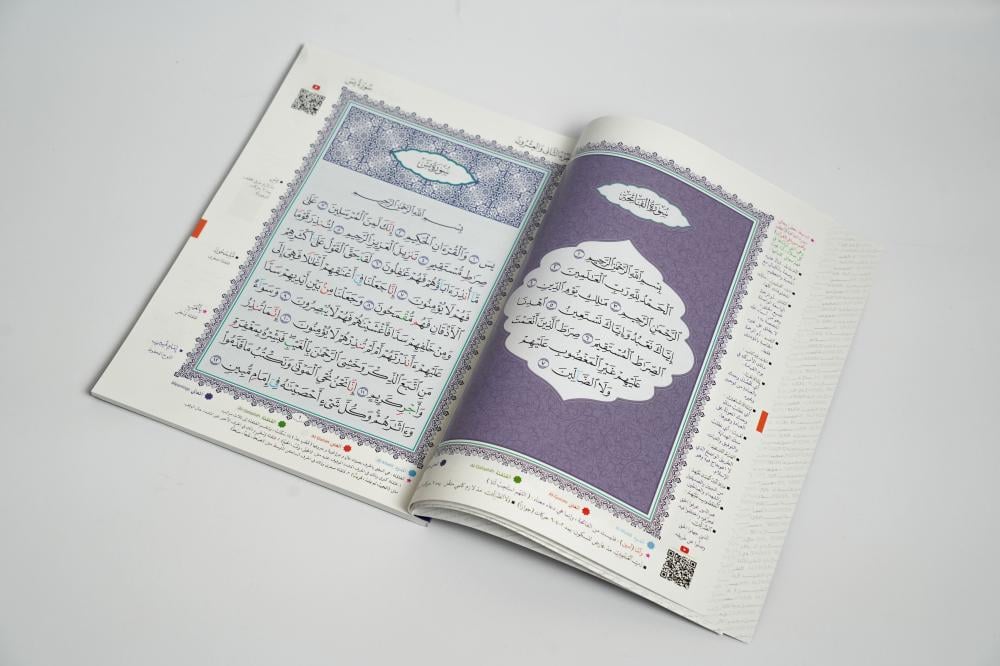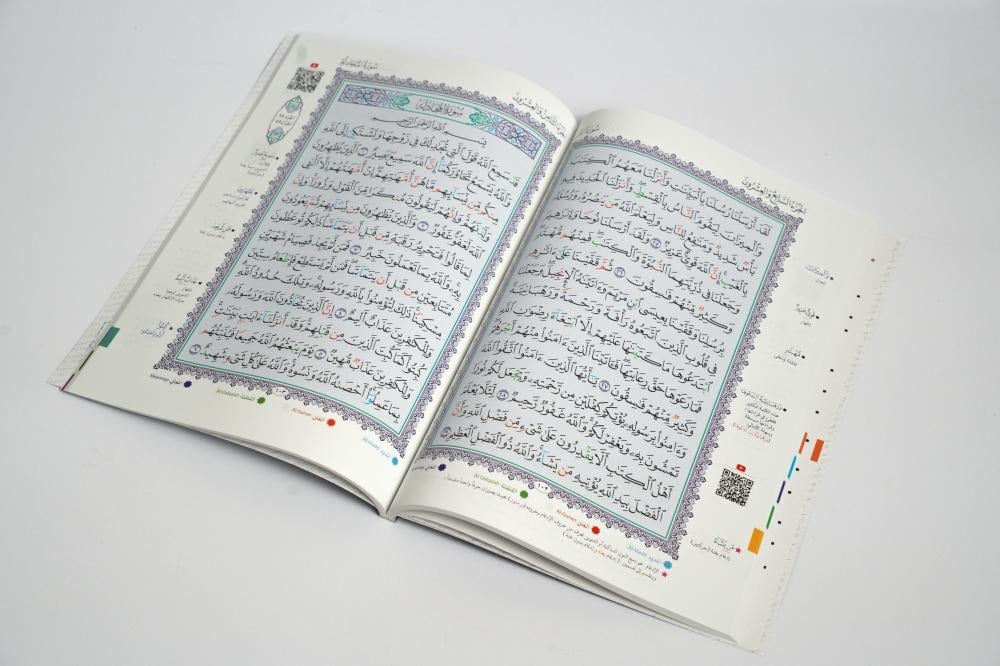 طبعة فاخرة تُظهر أحكام التجويد بالألوان لتسهيل القراءة الصحيحة وتثبيت النطق السليم.